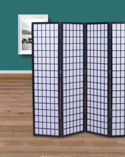 Le paravent 4 panneaux Nagoya avec un design reprenant des petits carreaux. Le cadre du paravent est en bois teinté noir et il est recouvert de papier de riz.